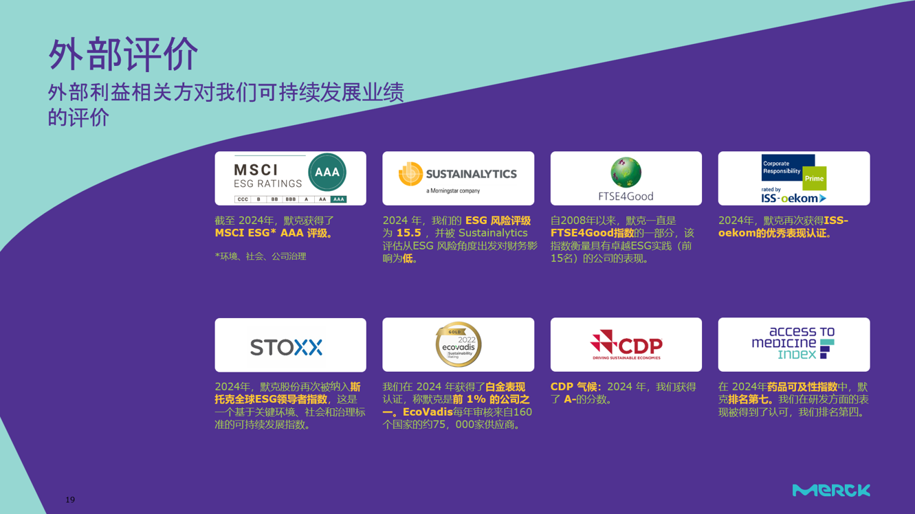 默克是一家充满活力的科技公司,至今已有 356 年的历史。可持续发展一直是我们工作的重中之重。我们坚 信为自然环境、员工和社会各方面的利益相关方创造长久的价值,能够帮助我们实现可持续发展的美好愿景。
